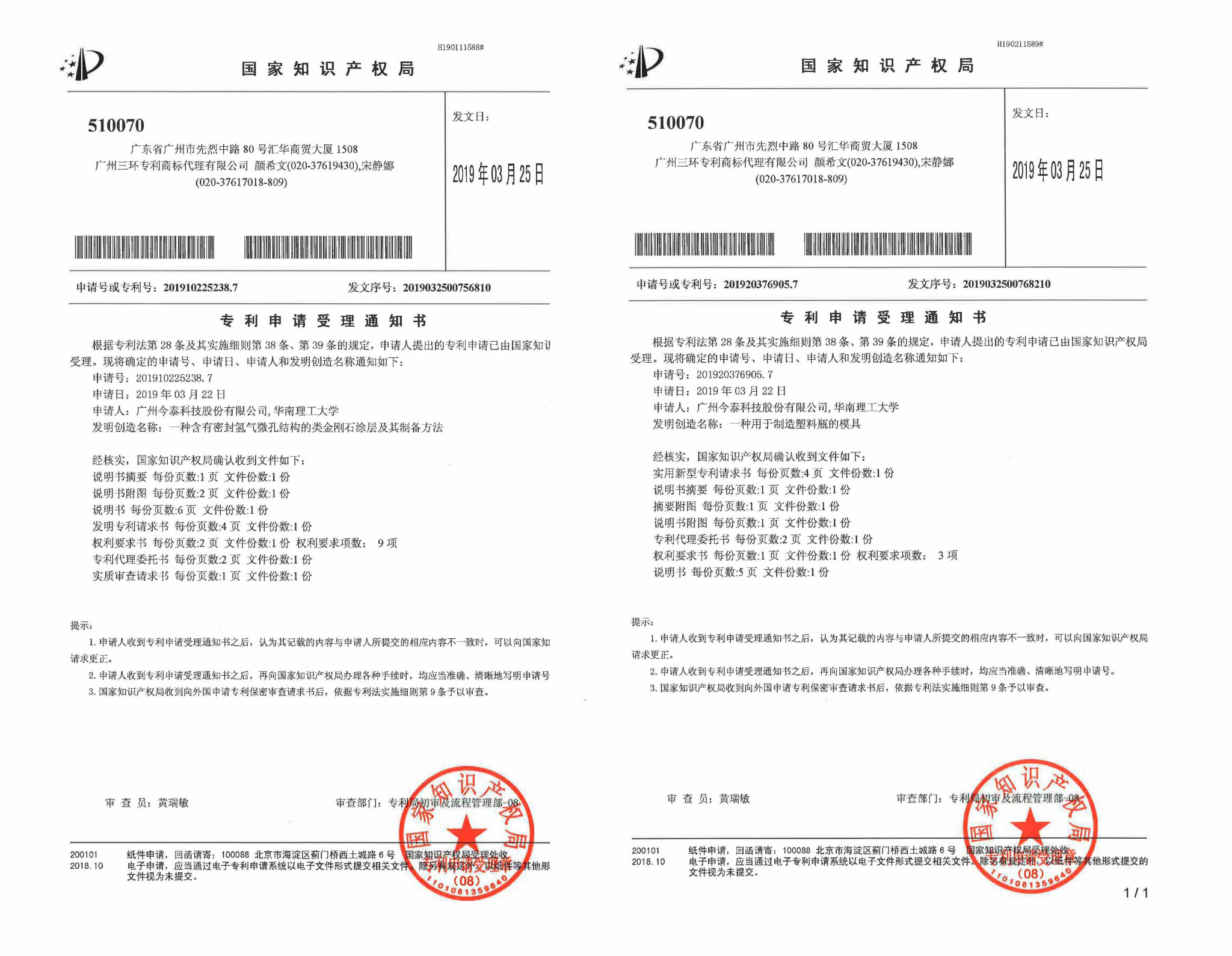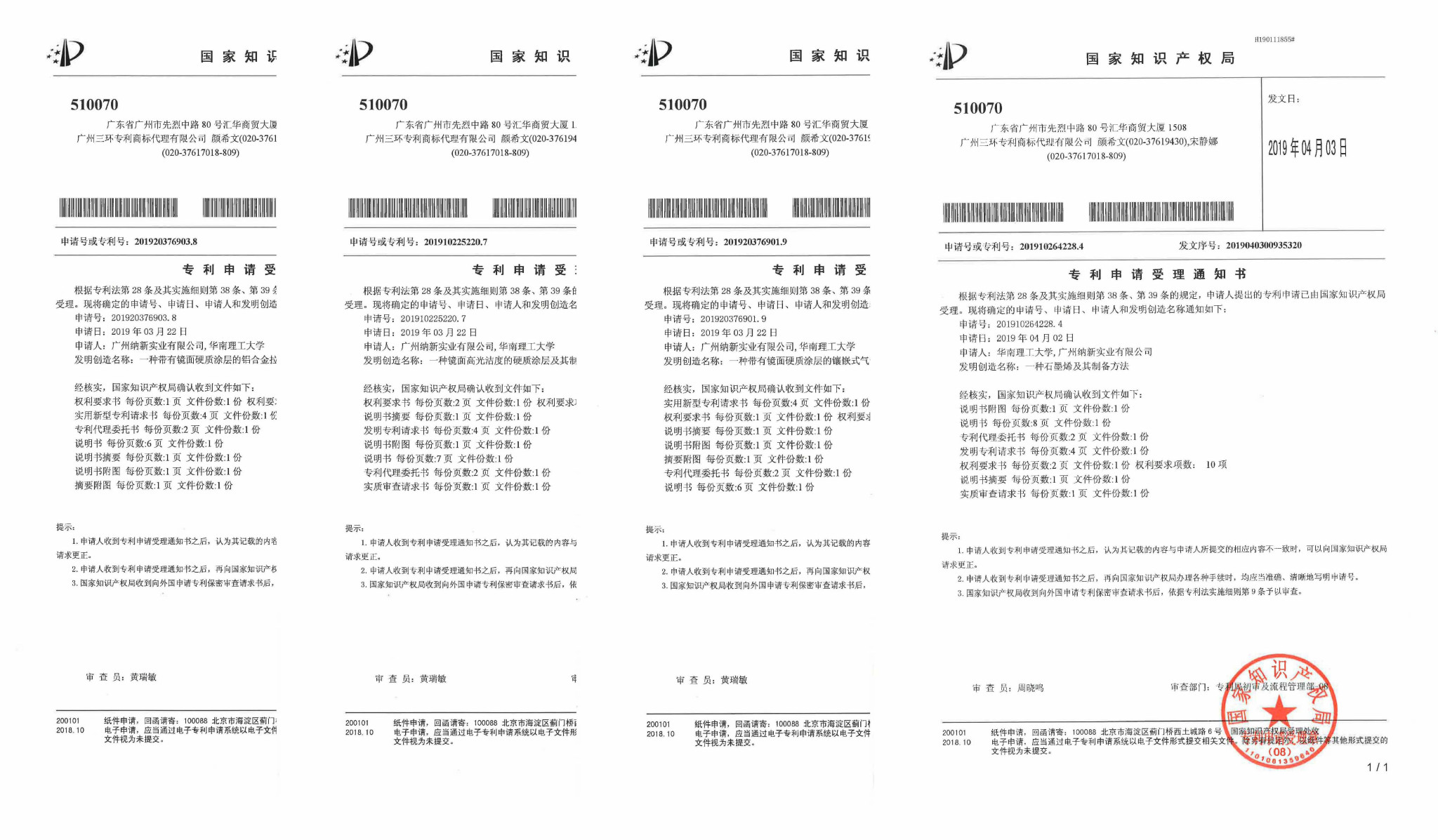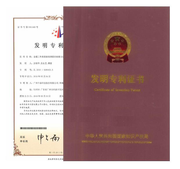 近日,廣州今泰科技股份有限公司(以下簡稱“公司”)于2016年5月申請的一項關于金屬工件表面(miàn)碳基薄膜的褪鍍方法發(fā)明專利,經(jīng)國(guó)家知識産權局嚴格審查,正式被(bèi)授予了專利權,另外公司近期新申請的一項發(fā)明專利及一項實用新型專利獲得受理,全資子公司廣州納新實業有限公司初次申請的兩(liǎng)項發(fā)明專利及兩(liǎng)項實用新型專利獲得受理。截至目前,公司及全資子公司已擁有專利合計39項,其中已授權專利27項(包括發(fā)明專利9項、實用新型專利17項、外觀設計專利1項);已受理專利12項(其中發(fā)明專利9項,實用新型專利3項)。