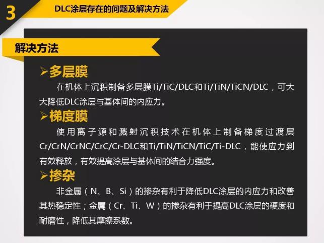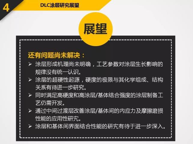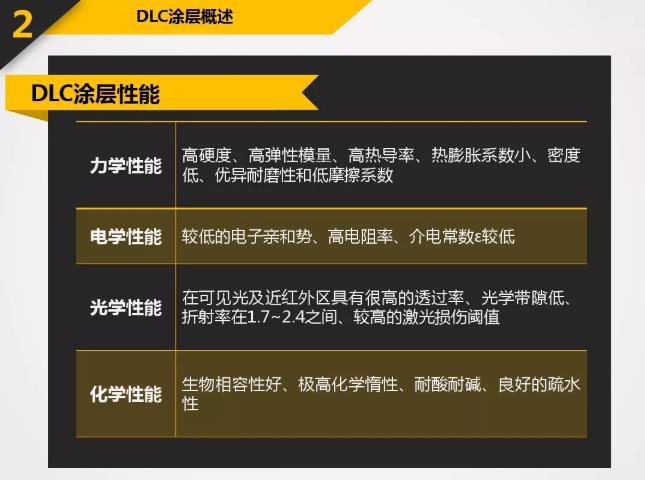 DLC具有很多優良的特性:高硬度-60GPa或Hv6000以上;低摩擦系數-0.06;極好(hǎo)的膜層緻密性;良好(hǎo)的化學(xué)穩定性以及良好(hǎo)的光學(xué)性能(néng)等。應用于刀具上的DLC塗層所表現出的特殊性能(néng)遠超過(guò)其它硬質塗層。塗以DLC的刀具主要應用包括:石墨切削,各種(zhǒng)有色金屬(如鋁合金,銅合金等)切削,非金屬硬質材料(如亞克力,玻璃纖維,PCB材料)切削等。