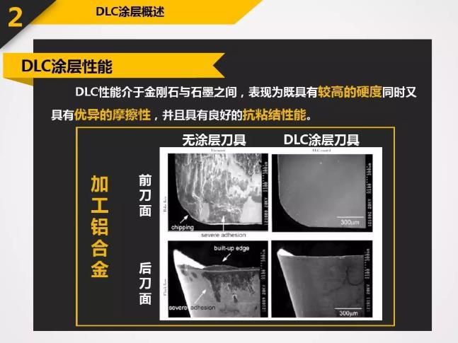 由于DLC具有極低的摩擦系數(0.05~0.2)和自潤滑性,塗以DLC的刀具是幹切削的最好(hǎo)選擇。與沒(méi)有塗層的刀具相比,在幹式切削的條件下DLC塗層刀具的切削力可下降6%,與其它塗層的刀具相比(如塗以TiN,TiAlN),在幹式切削的條件下DLC塗層刀具的切削力可下降23%;同樣(yàng)也是因爲DLC的低摩擦系數可使金屬切削(鋁合金切削)的切削力大爲下降,從而大大降低能(néng)源消耗。在有冷卻液的切削條件下,DLC塗層刀具的切削力比沒(méi)有塗層刀具和其它塗層刀具下降18%,而且被(bèi)加工的金屬表面(miàn)粗糙度下降Ra0.04~R0.23um),達到Ra0.38。