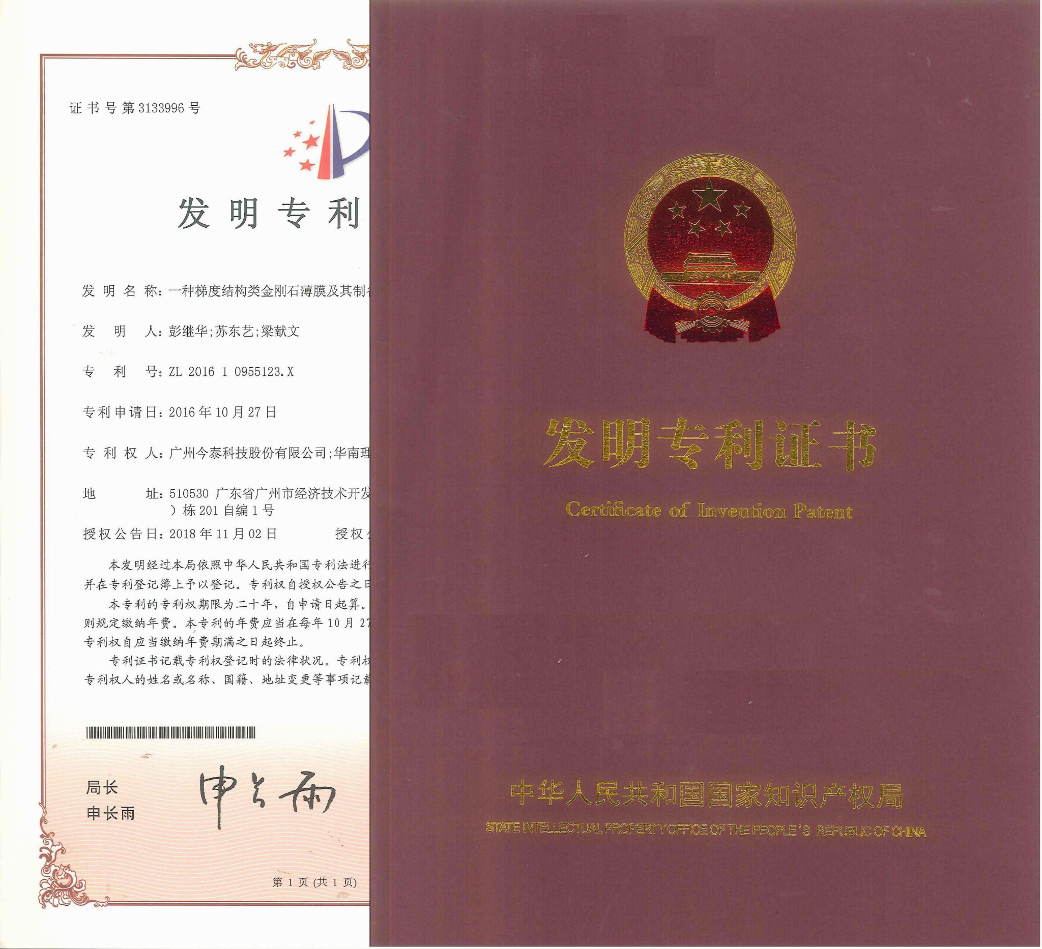 公司繼今年獲得兩(liǎng)項發(fā)明專利授權後(hòu),近日,公司于2016年12月申報的一項一種(zhǒng)梯度結構類金剛石薄膜及其制備方法的發(fā)明專利及2017年12月申報關于真空氣相裝備核心元器件的三項實用新型專利,正式被(bèi)國(guó)家知識産權局授予了專利權。
